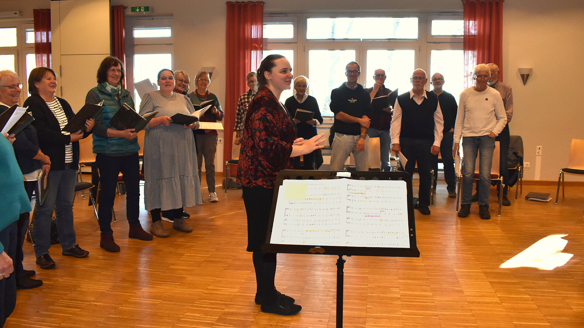 Der in diesem Herbst stattgefundene Proben-Samstag war dabei ein ganz besonderer. Wir hatten die Sängerin und Dipl. Gesangpädagogin Anne-Sophie Balg zu Gast um unseren Chor zu coachen. Innerhalb von 2 Std. schaffte sie es mit ihrer spritzigen und humorvollen Art, uns aus der ach so bequemen sitzenden Haltung zu locken, so dass es niemanden mehr auf den Stühlen hielt. Fortan agierten wir selbstverantwortlich mit vollem Körpereinsatz als gestandene Sänger, denn wie Anne-Sophie eindringlich verkündete: "Wer singt, der steht!" Unter ihrer Anleitung entwickelte unser Chor ein beträchtliches, lebendiges Klangvolumen. Wir danken Anne-Sophie für diesen ganz besonderen Tag.