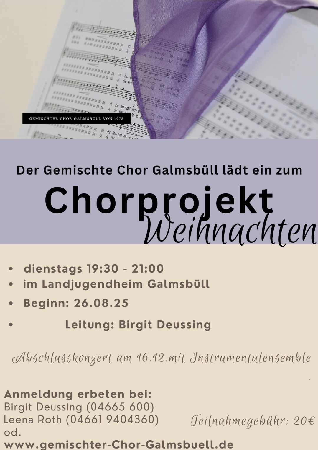 Wir sind immer offen für Neuzugang. Wenn du Lust hast, schau bei uns rein und nehme an den Proben teil - nur so zum Ausprobieren. Du darfst einfach an einem Dienstag um 19:30 Uhr mal dazukommen. Oder du nimmst telefonisch Kontakt mit unserer Chorleiterin Birgit Deussing (04665/600) auf oder benutzt unser Kontaktformular